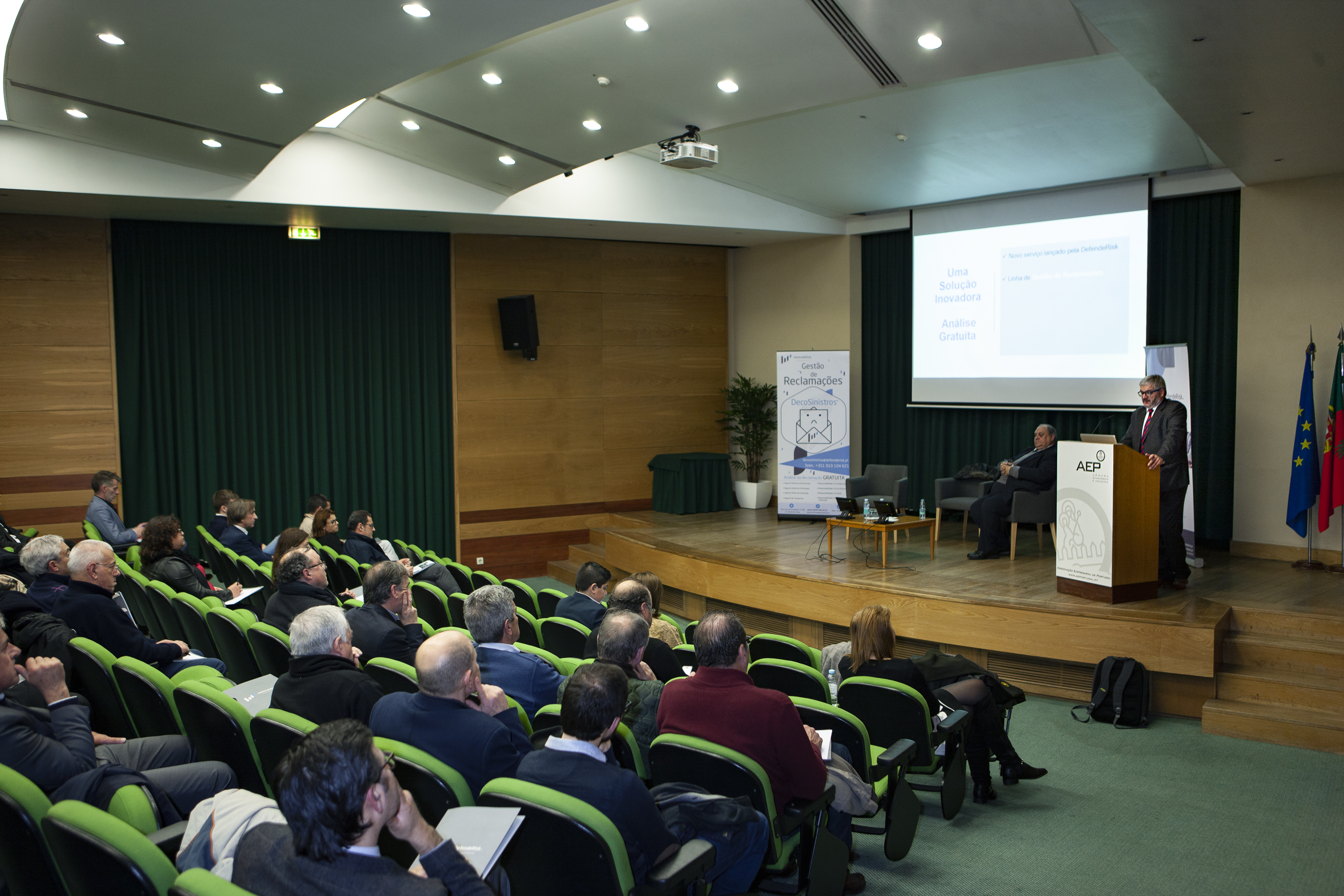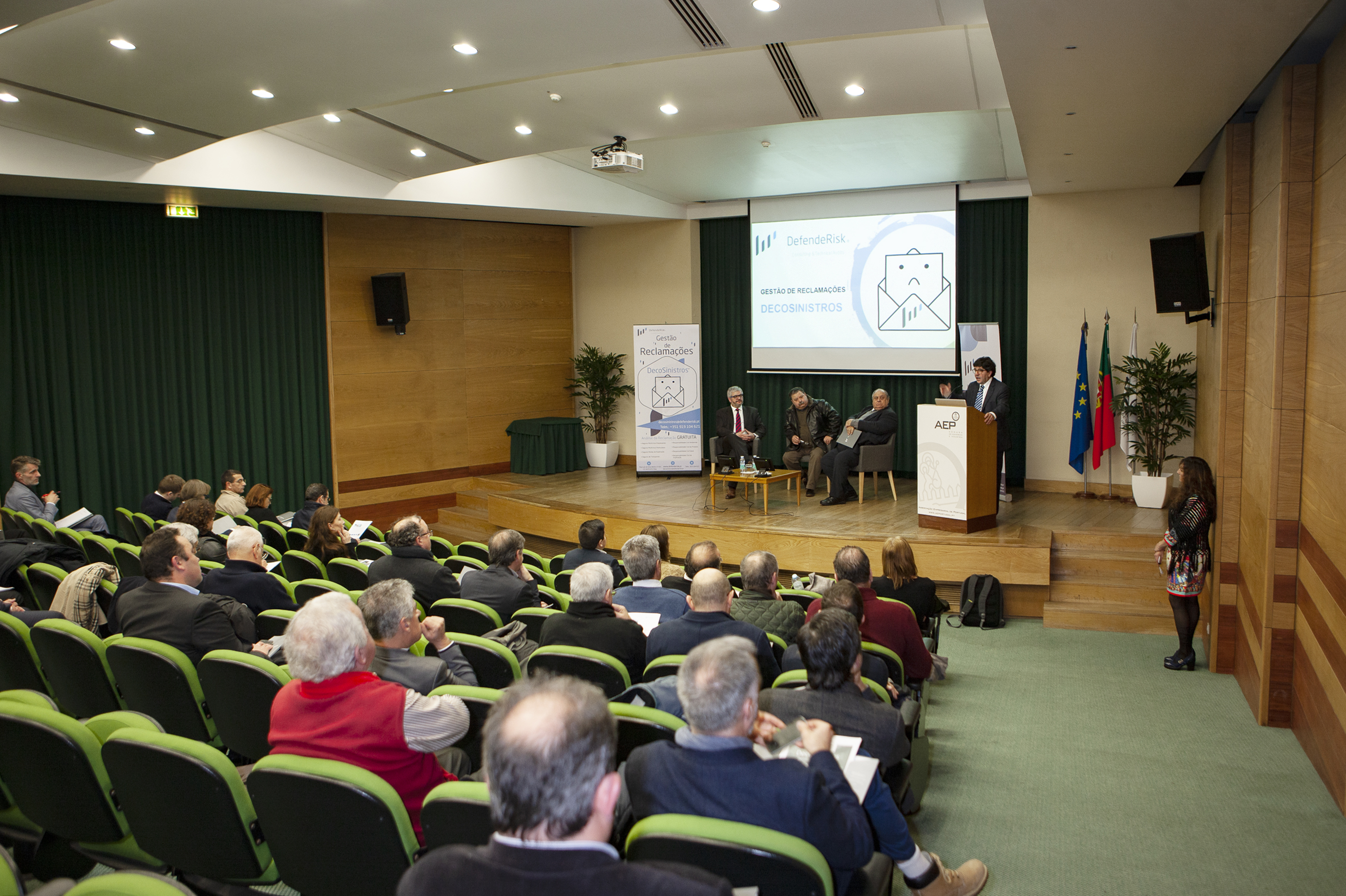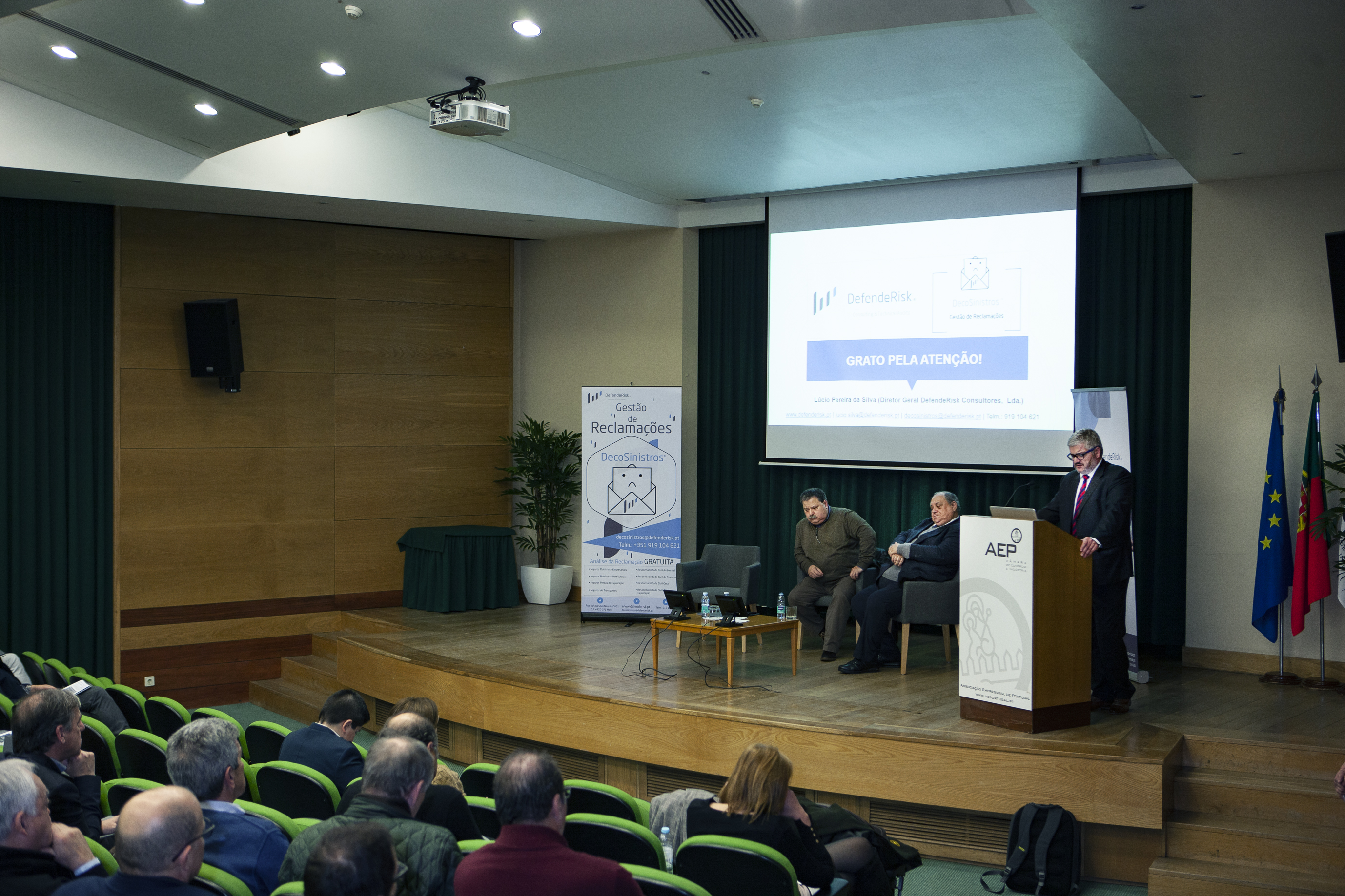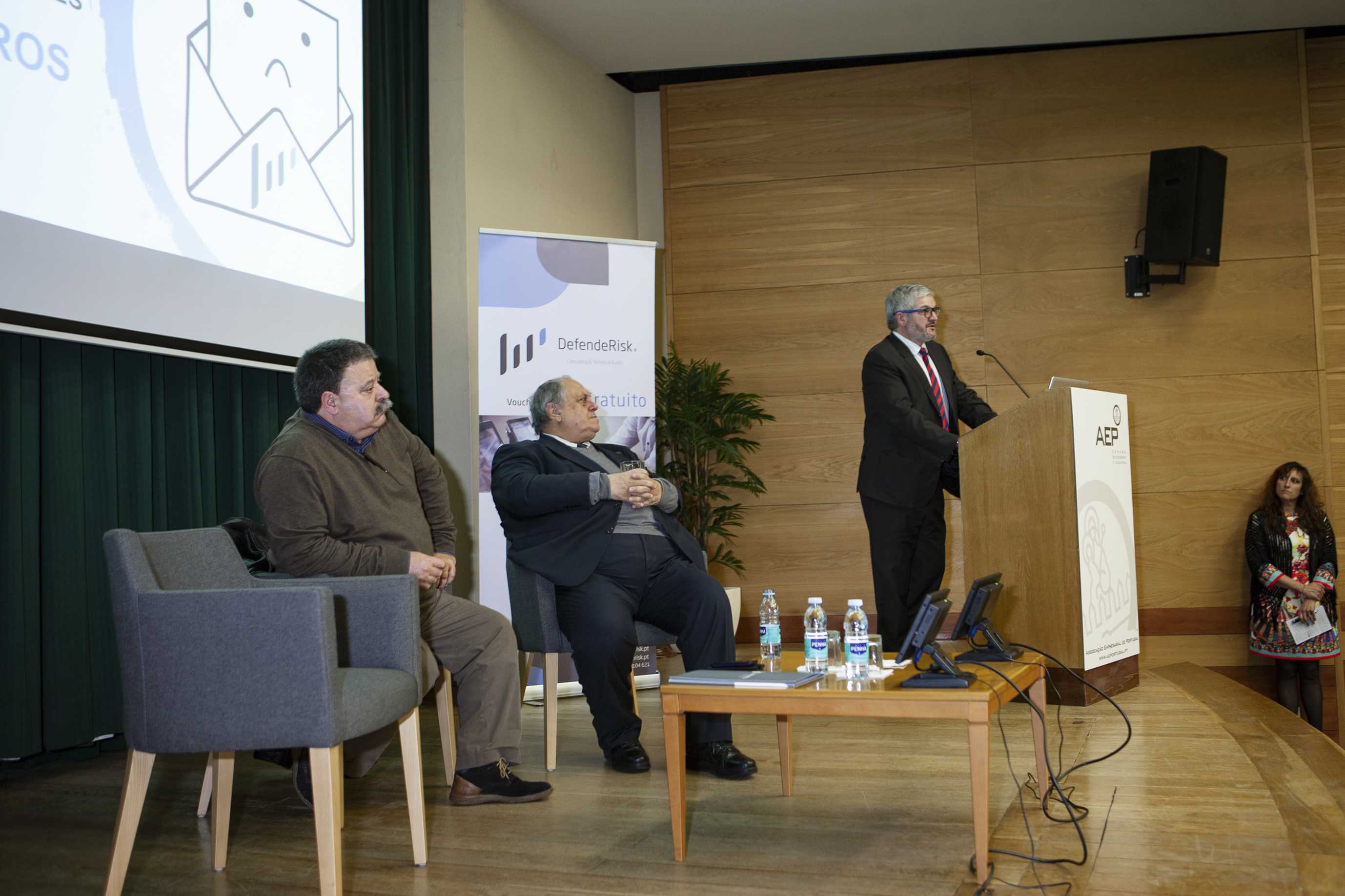 Na sessão, introduzida por António Pêgo, diretor da formação e apoio a serviços às empresas da AEP, foi divulgada a parceria entre a DefendeRisk e a instituição acolhedora do evento, no que diz respeito a formações nas áreas temáticas de Peritagem, Gestão do Risco e Gestão de Conflitos. A primeira formação arranca já no próximo mês de março.